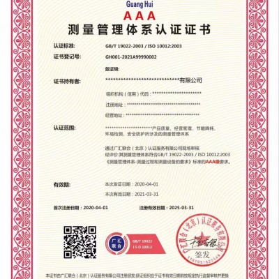 五、合格组织由认证机构颁发证书 测量管理体系认证是指审核组织在产品质量、经营管理、节能降耗、环境监测等方面是否符合GB/T19022-2003/ISO10012-2003《测量管理体系—测量过程和测量设备的要求》标准中所提出的测量过程、不合格测量过程、测量不确定度、测量体系的监视等条款的要求。 ISO10012认证(测量管理体系认证)证书分为三个级别:AAA级、AA级、A级。三个级别符合条款要求的程度不同。